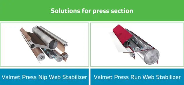Valmet Press Nip Web Stabilizer is installed before the separate press to prevent the detachment of the web from the press felt. Valmet Press Run Web Stabilizer is to support the sheet as fully as possible while it travels between the press and dryer sections.