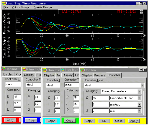 This picture (from the Loop Simulator) shows the effects of a PI controller with too much or too little P or I action. The process is typical with a dead time of 4 and lag time of 10. Optimal is red.