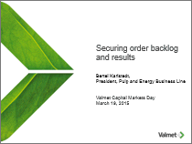 Valmetin pääomamarkkinapäivä analyytikoille ja institutionaalisille sijoittajaille järjestettiin Lontoossa torstaina 19. maaliskuuta 2015. Tapahtuma järjestettiin noin klo 11.00-17.15 paikallista aikaa (GMT) Andaz Liverpool Street -hotellissa (40 Liverpool Street, Lontoo). Pääomamarkkinapäivän tarkoituksena oli jakaa tietoa Valmetin strategiasta ja liiketoimintanäkymistä.