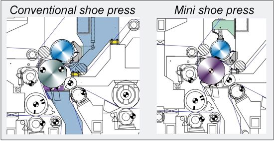 The mini shoe press rebuild includes a shoe press roll on which the shoe length and roll diameter have been minimized. The diameter of the counter roll, a solid roll, also has been optimized. The rebuild can be carried out with minimal changes to the existing press section geometry, frame and surrounding components, which significantly shortens shutdown time. Paper and board makers will get from paper to paper sooner and the increased production and efficiency thanks to the rebuild yields a shorter investment payback time.