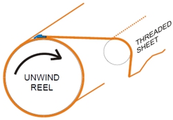 2. Slab off the defective paper or change the reel. To slab off the paper, run the unwind at thread speed while holding the tail of the reel sheet. The tail of the threaded sheet will pile up in front of the reel.