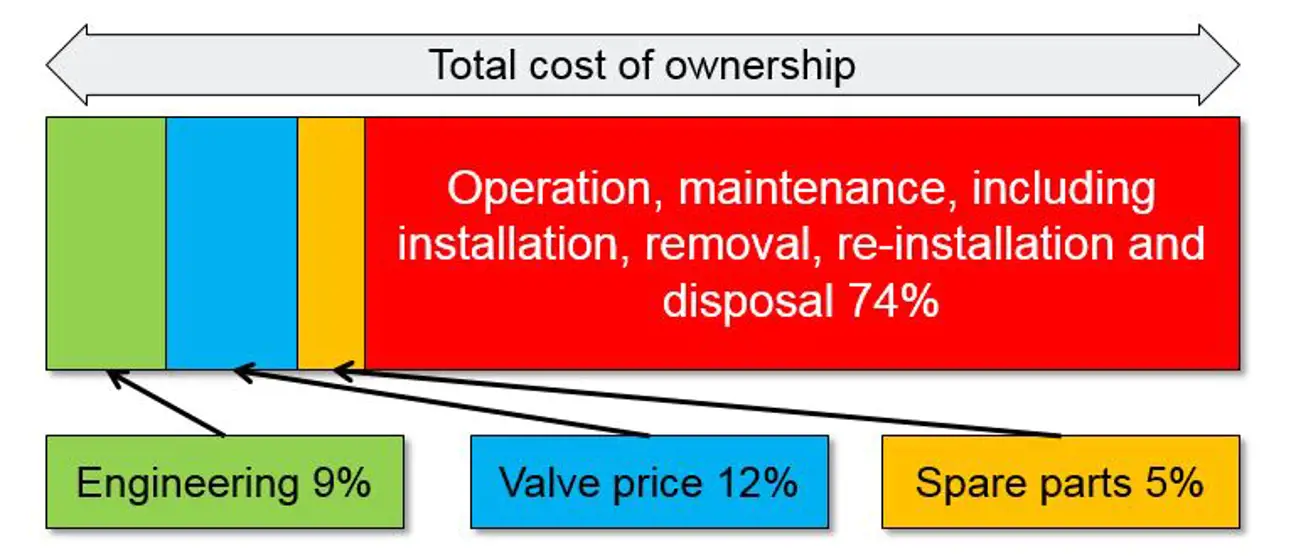 Traditionally, the direct purchasing cost of devices has been seen as one source of savings, sometimes even at the expense of the device’s quality and performance. Moreover, it has been estimated by some oil & gas valve end users that only 10–30% of the total costs of control valve ownership is related to the valve purchase price, whereas 70–90% can be attributed to maintenance, repair, and operation (MRO). In addition, it is important to consider the total financial impact of possible device failures on plant production. A small savings in purchasing costs upfront at the expense of device quality can cause much larger expenses through process upsets and device maintenance costs later on.