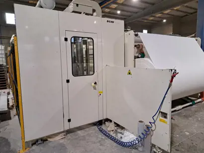 Automated rewinder for tissue toilet rolls and kitchen towels production.
