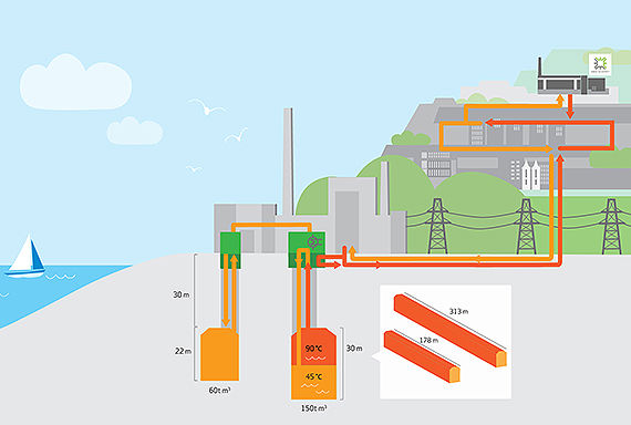 在地下约30米深的基岩中,有两个数十年前用来储存石油的洞穴。它们已被清空,清洁并被用于热存储,总容量为210,000立方米。